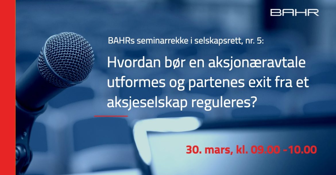 BAHR inviterer til seminarrekke i selskapsrett. Her behandles de mest interessante temaene innenfor selskapsretten. I det femte seminaret i rekken er temaet: