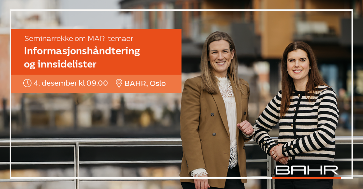 BAHR inviterer til serie med morgenseminarer med utvalgte temaer under Markedsmisbruksforordningen (MAR). Seminarene retter seg primært mot ansatte og styremedlemmer i børsnoterte selskaper, men kan også passe for andre som trenger en innføring eller oppfriskning i temaene.