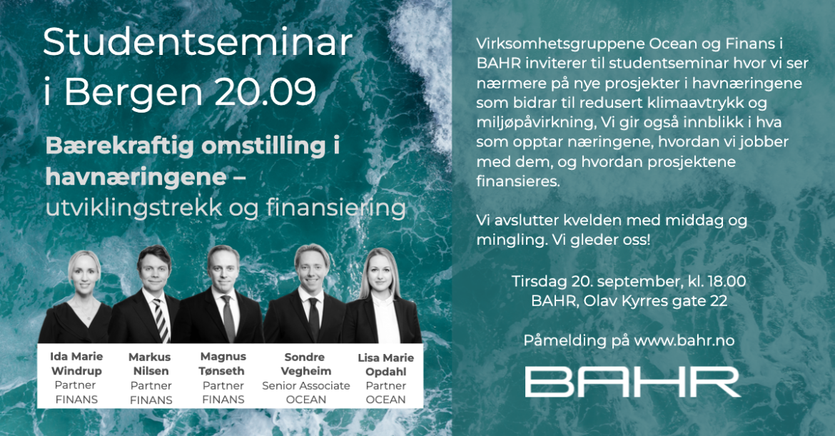Events Studentseminar i Bergen | Bærekraftig omstilling i havnæringene September 20, 202218:00 - 22:00BAHR, Olav Kyrres gate 22, Bergen, Norway