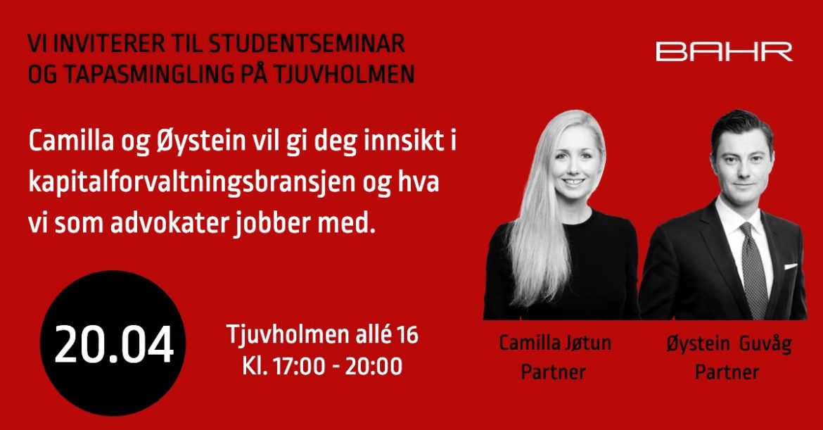 Events Studentseminar om kapitalforvaltning og private equity April 20, 202217:00 - 20:00BAHR, Tjuvholmen allé 16, Oslo, Norge I tillegg vil du møte flere av Camilla og Øysteins kolleger.