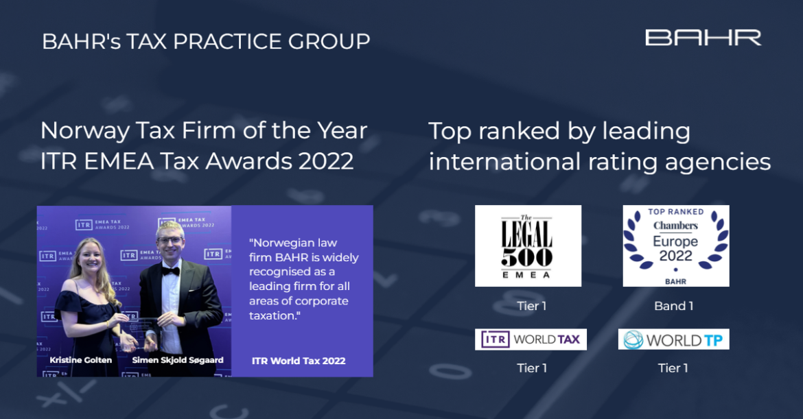 BAHR's Tax Practice Group is proud of the external recognition it has received in 2022. The BAHR tax team is actively involved in professional tax deliberations with academics as well as leaders in key industry markets within real estate, shipping, oil & energy, fisheries and aquaculture, as well as fund structuring and asset management, and possesses cutting edge insight into the special tax regimes in force for hydropower, shipping and offshore oil and gas.