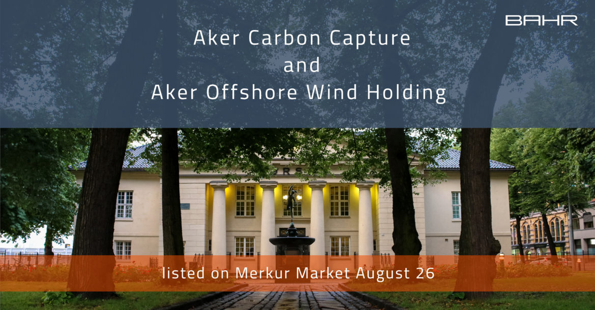 BAHR has assisted Aker Solutions ASA and its subsidiaries Aker Carbon Capture AS and Aker Offshore Wind Holding AS in connection with private placements of approximately NOK 500 million in each of Aker Carbon Capture and Aker Offshore Wind Holding, and the subsequent listing of the companies on Merkur Market, a multilateral trading facility operated by Oslo Børs.