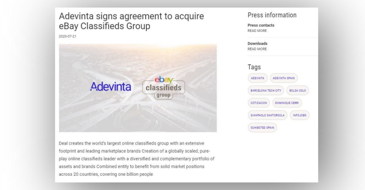 As part of the transaction, it has also been agreed that Schibsted shall acquire eBay Classifieds Group’s Denmark assets for USD 330 million, reducing the cash consideration from Adevinta to approximately USD 2.17 billion.