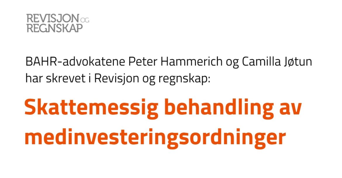 BAHR-advokatene Peter Hammerich og Camilla Jøtun har skrevet artikkel i Revisjon og Regnskap nr. 3 2019 om skattemessig klassifisering av medinvesteringsordninger for ansatte.