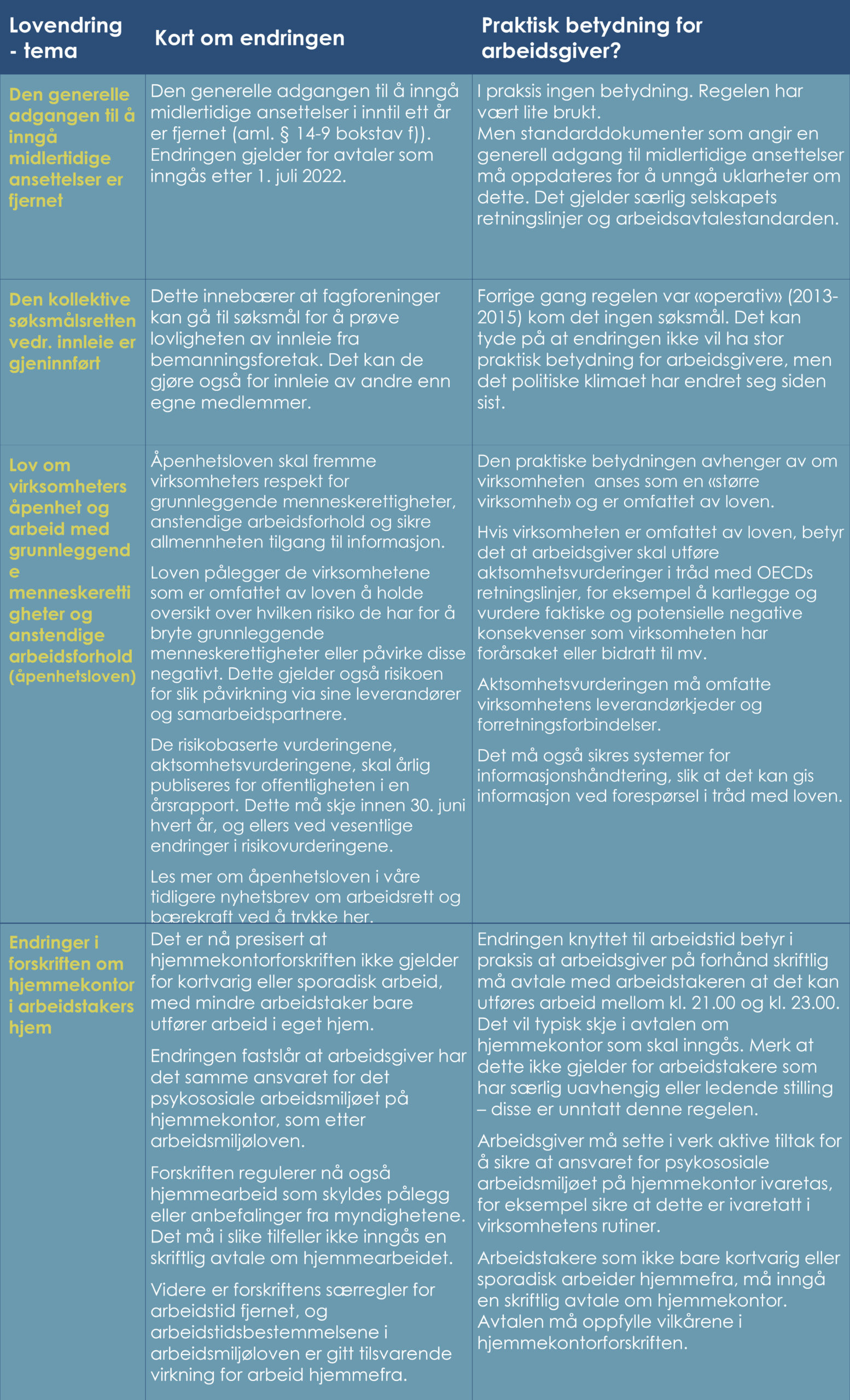 Sommerferien er allerede godt i gang for mange. Men det er likevel viktig å huske på at det med virkning fra 1. juli 2022 ble innført flere nye regler som påvirker norske arbeidsgivere. Vi har i dette nyhetsbrevet laget en kort skjematisk oversikt over de viktigste lovendringene. Og ikke minst peker vi på hva lovendringene kort oppsummert betyr i praksis.