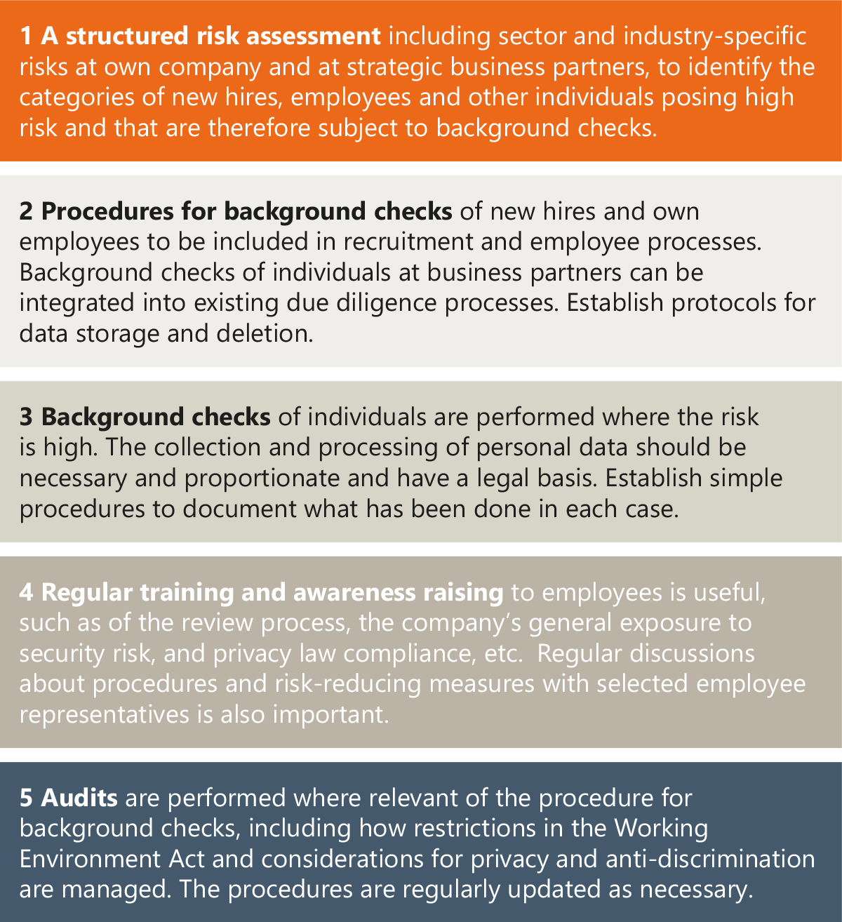 Until further clarity is provided in laws and guidance material, our recommendation is that asset managers should include background checks of individuals in their existing hiring, KYC and screening process for new investments and add-ons along the recommendations in step 1-5 below. More importantly, asset managers should include concrete follow-up activities in the active ownership process to ensure that portfolio companies implement the same procedures based on risk.