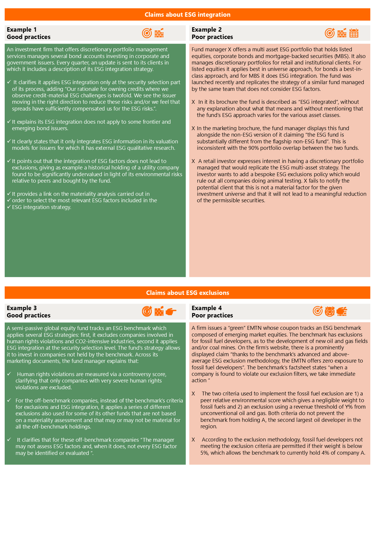• Don’t claim ESG exclusions without defined criteria – Don’t claim to adopt an ESG exclusions strategy if the exclusion rules are not based on defined criteria and applied consistently