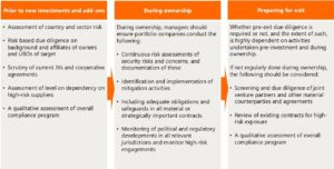 Asset managers and their portfolio companies should focus their attention and efforts to those areas where the risk is highest, which typically is in relation to engagements with a link – directly or indirectly – to high-risk regimes. This may include Russia and China, but also third countries and partners collaborating with these regimes. For instance, individuals and entities representing Russia, China, and other authoritarian regimes, are increasingly making minority investments in companies or joint ventures and entering into other types of cooperative agreements, which can provide access to sensitive information which may be used for unwanted purposes. Additionally, foreign suppliers linked to individuals or entities associated with authoritarian regimes pose a similar threat. Supplier engagements can easily be exploited for information and espionage purposes.