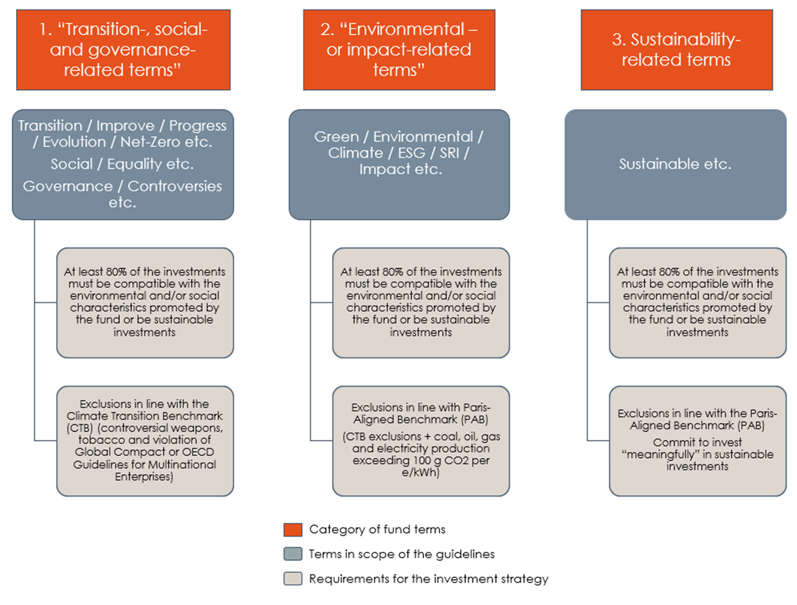 The guidelines distinguish between three categories of terms and corresponding requirements for the investment strategy, which we have summarized in the chart below. We have included the terms explicitly mentioned in the guidelines as being within scope. The examples listed in the guidelines (and referenced in the chart below) are non-exhaustive. Funds using one of these terms will have to assess whether they fulfill the requirements for the investment strategy.