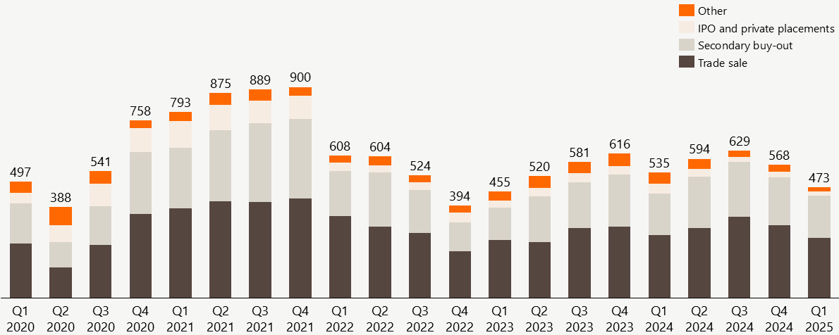 Figure 1: Private equity-backed exits by type, Q1 2020-Q1 2025, # of exits