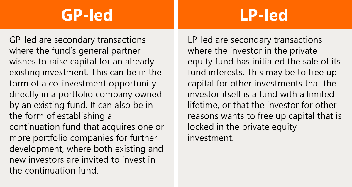 As an alternative to a traditional exit route, PE firms are increasingly exploring other ways to return capital to investors and manage the fund lifecycle without fully exiting their portfolio companies. One such method is a secondary transaction, which may be initiated by the GP or LP. In periods of market volatility or when stock markets are in decline, both LP- and GP-led secondary transactions tend to rise. In the following we focus on GP-led secondary transactions, in the form of continuation funds. (For our perspective on LP -led transactions, see our newsletter here.)
