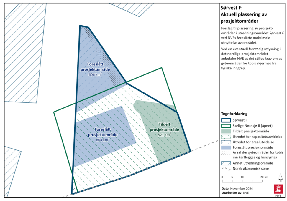 NVE Sørvest F illustration: NVE illustration of proposal for locations of possible new project areas, assuming maximum utilization of the capacity in the Sørvest F Area. Note NVE proposes that only one of the blue shaded areas are awarded in 2025. - NVE is of the view that the extended UN-area i.e. the Vestavind F area (suitable for floating turbines) can be opened for offshore wind, and the developed capacity in the area can be increased from today’s 1500 MW by an order of 500 – 750 MW either by opening for increased capacity in the three existing project areas or by establishing a new project area in the north of the Vestavind B area.