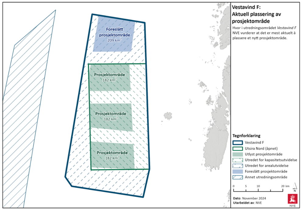 NVE Vestavind F illustration (Utsira Nord extended area): NVE illustration of proposal for location for possible new project area (assuming maximum utilization of the capacity in the Vestavind F Area).
