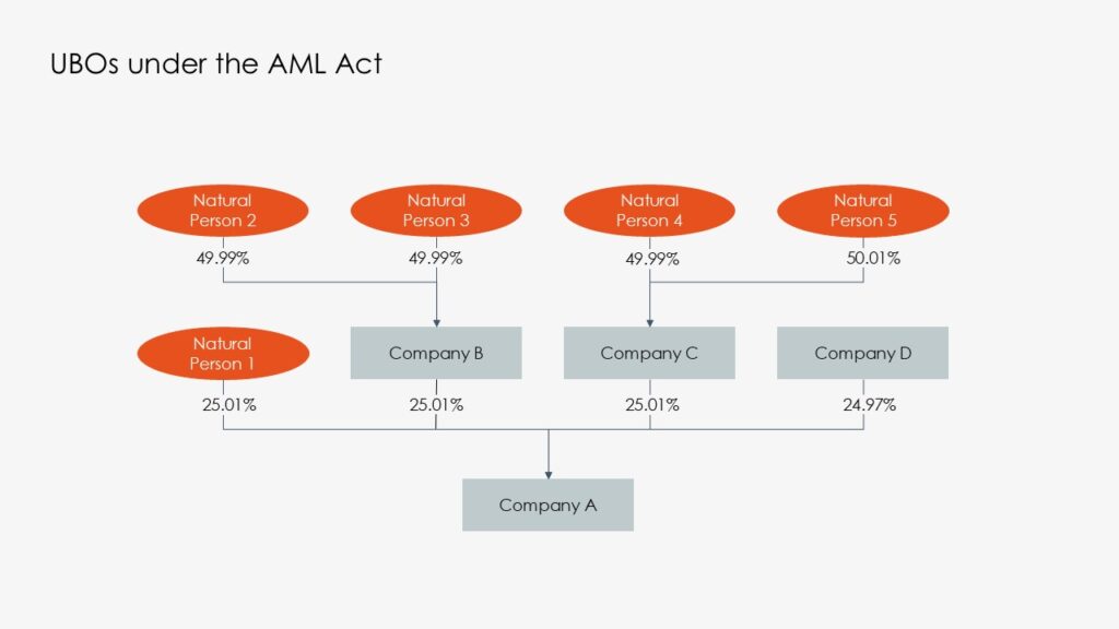 Two practical examples – and differences, compared to the Norwegian Anti-Money Laundering Act – are the rules on direct and indirect beneficial ownership through ownership of shares: