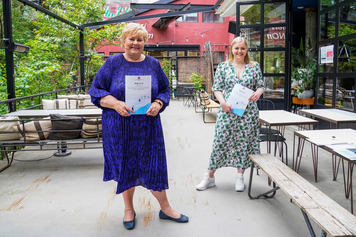 Prime Minister Erna Solberg and Minister of Petroleum and Energy Tina Bru presenting the report “Energy to work” (Energi til arbeid Meld. St. 36 (2020-2021) in Oslo on June 11, 2021.
