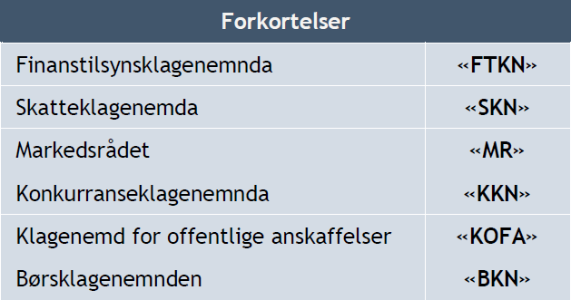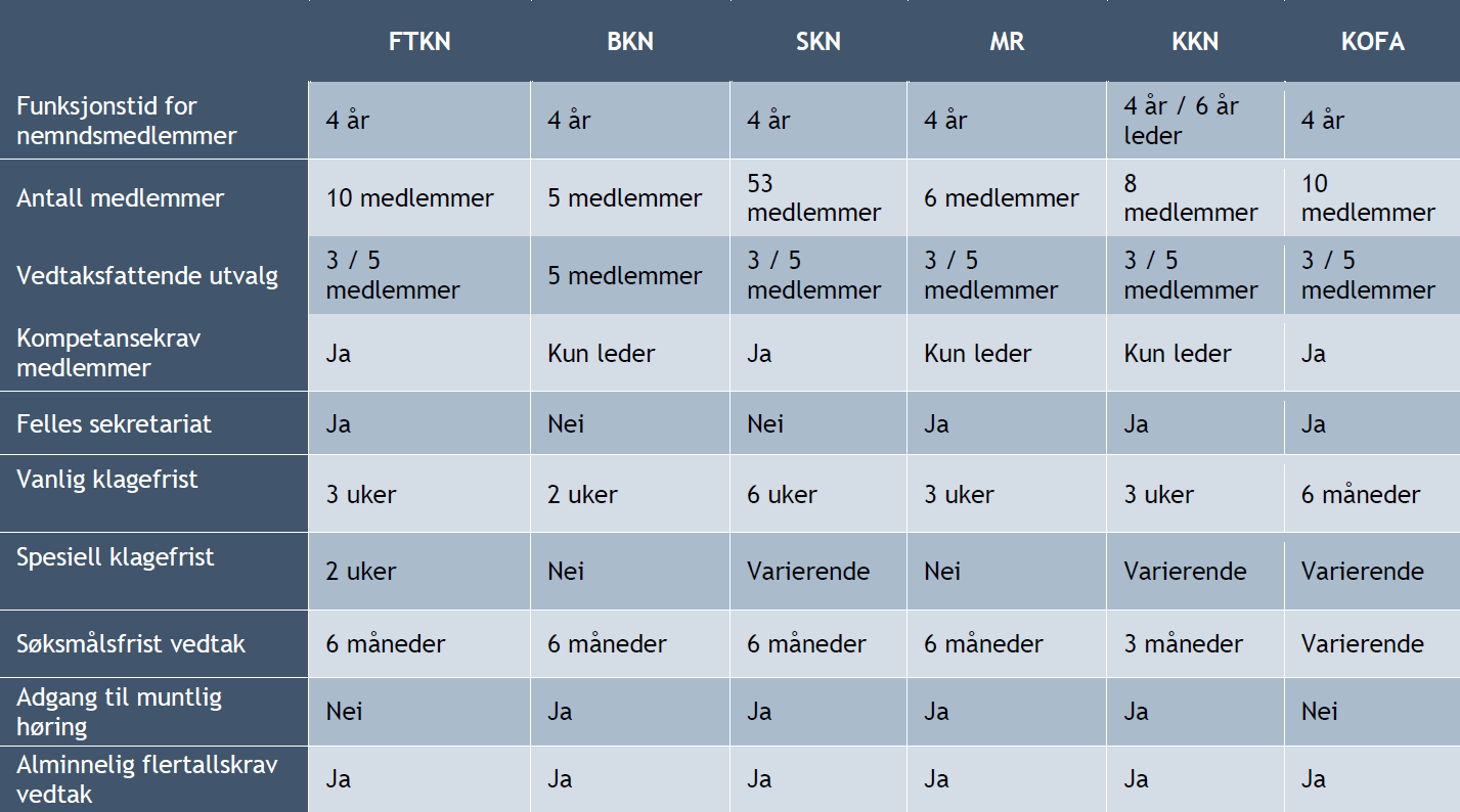 Oversikten nedenfor viser en skjematisk sammenligning av sentrale aspekter ved den foreslåtte Finanstilsynsklagenemnda mot tilsvarende aspekter ved andre klagenemnder: