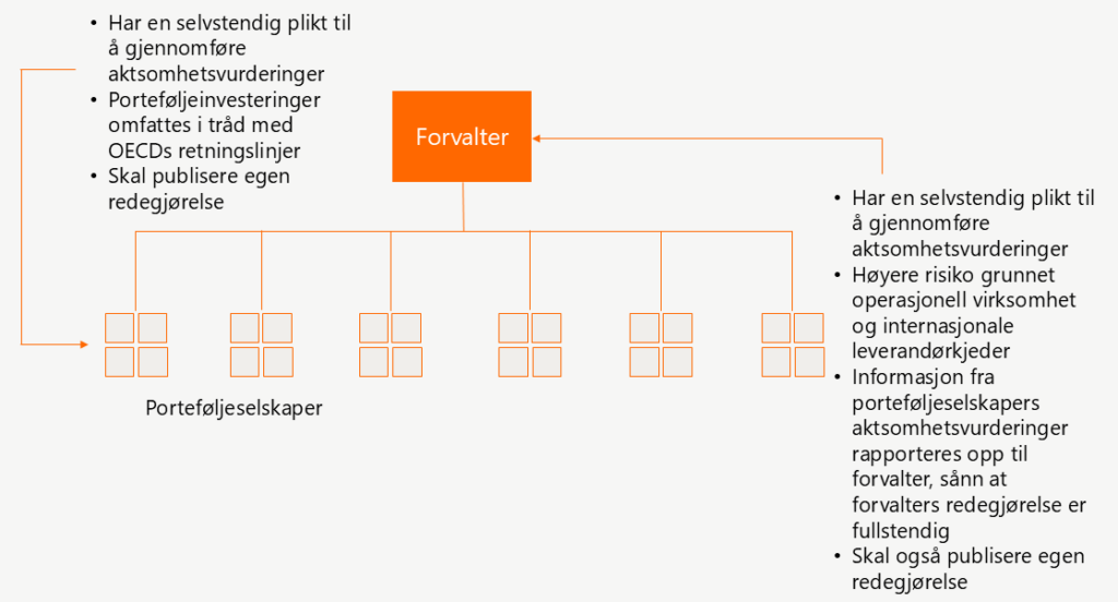 For kapitalforvaltere som oppfyller tersklene i loven, innebærer dette at de må gjennomføre egne aktsomhetsvurderinger i tråd med lovkravene, og sørge for at porteføljeselskapene gjør det samme. Selv om åpenhetsloven ikke eksplisitt pålegger forvaltere å inkludere porteføljeselskapenes aktiviteter i sin redegjørelse, må aktsomhetsplikten leses i lys av OECDs retningslinjer for flernasjonale selskaper, slik det også fremgår av lovens forarbeider. En rekke norske forvaltere har også investeringspolicyer og investorspesifikke krav som eksplisitt viser til OECDs retningslinjer som et sentralt rammeverk. Ifølge OECDs sektorveileder for institusjonelle investorer skal porteføljeinvesteringer, inkludert minoritetsinvesteringer, i utgangspunktet inngå i aktsomhetsvurderingene.