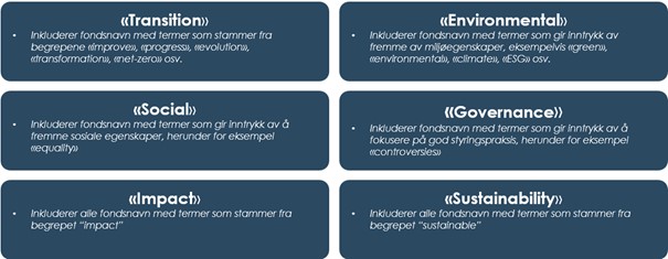 Retningslinjene vil gjelde for fond med ESG- eller bærekraftsrelaterte termer i fondsnavnet. Illustrasjonen under oppsummerer de kategoriene av fondsnavn som omfattes av retningslinjene, og inkluderer eksempler på konkrete termer innenfor de ulike kategoriene.