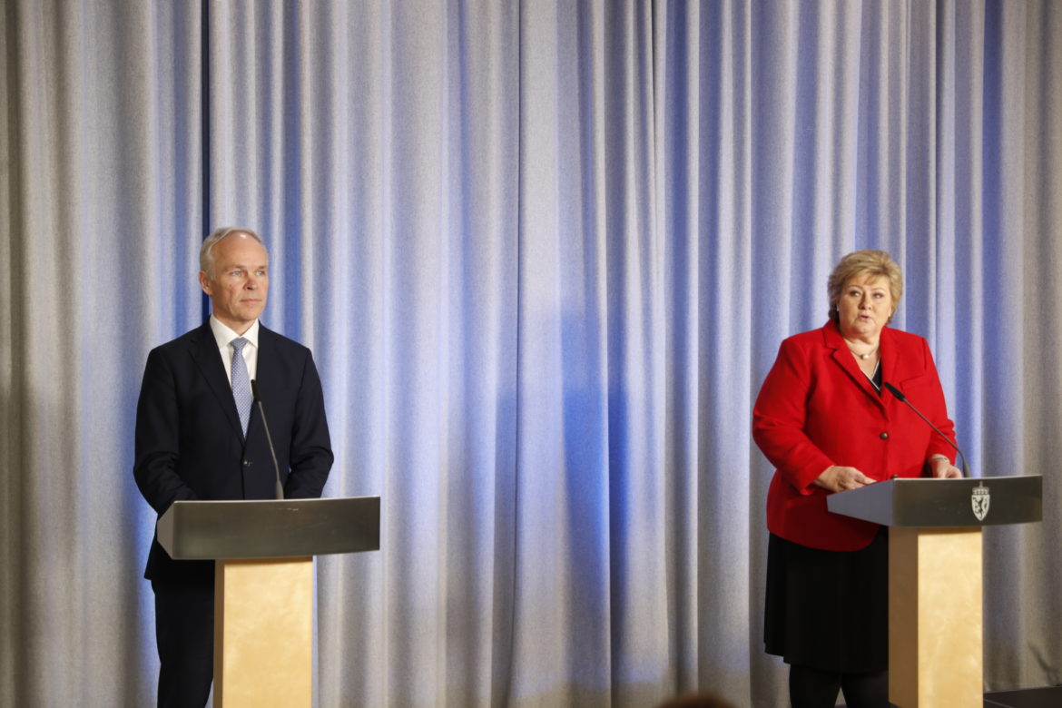 Bilde: Statsminister Erna Solberg og finansminister Jan Tore Sanner orienterer i pressekonferanse 27. mars om tiltak for å støtte bedrifter og næringsdrivende, sikre arbeidsplasser og styrke næringslivet som rammes hardt av koronavirusutbruddet i Norge. Foto: Ole Berg-Rusten / NTB scanpix