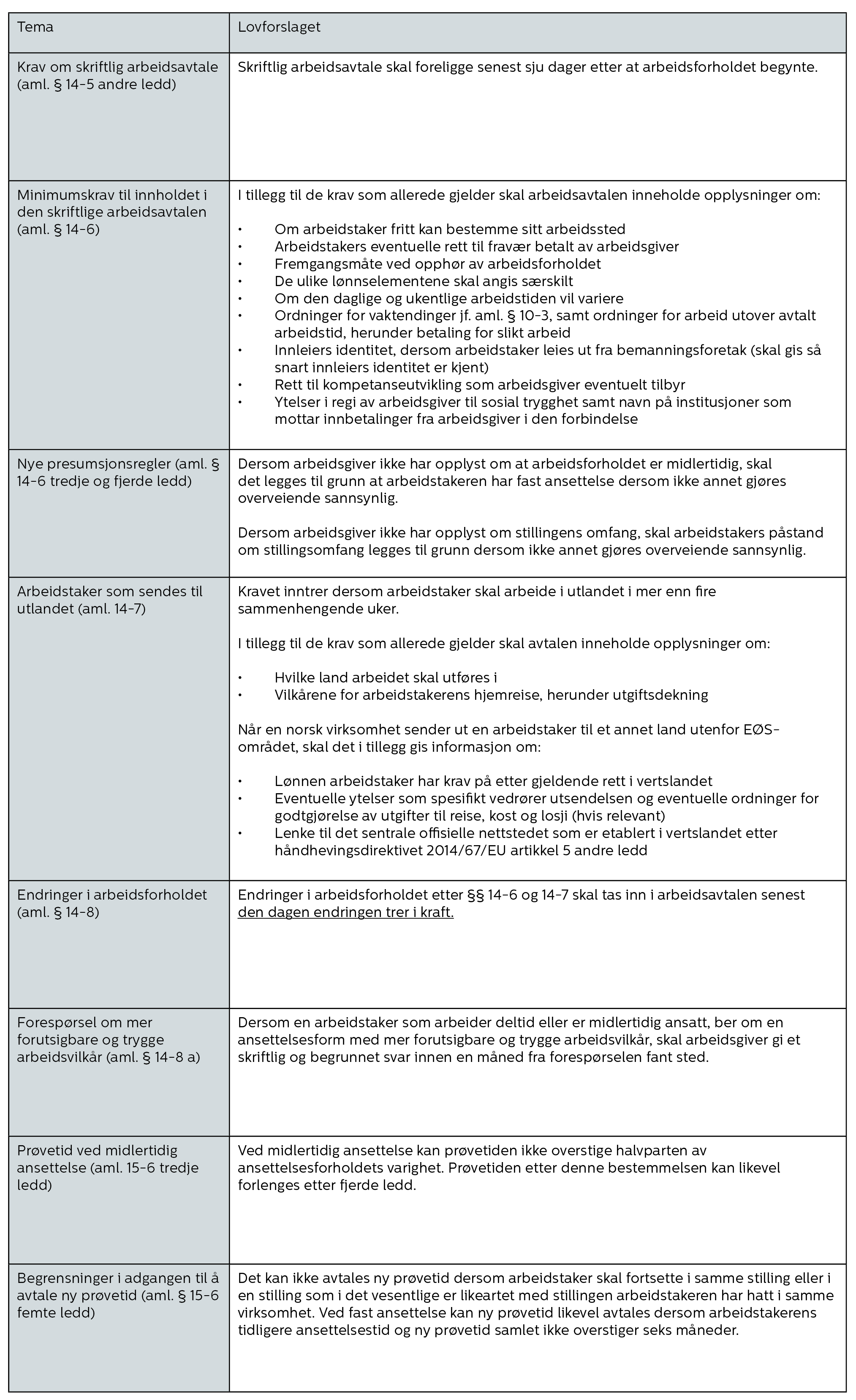 Lovforslaget innebærer at kravene til hva ansettelsesavtalen må inneholde av reguleringer og opplysninger utvides. Selv om departementet i proposisjonen understreker at lovforslaget ikke tar sikte på å trekke opp grensene for styringsretten eller endre de grenser som i dag gjelder, vil likevel mer informasjon i arbeidsavtalene kunne innebære at det fremover blir flere vanskelige tolkningsspørsmål.