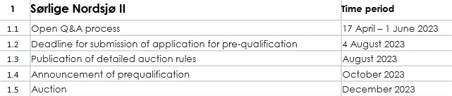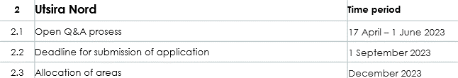 The Government intends to award the three project areas after a competitive process based on qualitative criteria. There will not be a prior pre-qualification process. The application deadline is 1 September 2023 at 12:00. Expected award is in December 2023. The project with the highest score will be awarded its preferred area, with the project with the next best score being awarded its preferred area of the two remaining areas, and the third best project being awarded the last remaining area.