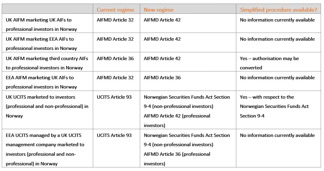 On Exit Day, the UK will be regarded as a third country. Managers based in third countries are not eligible for the passporting regimes set out in the UCITS Directive or the AIFMD. On 4 April 2019, the Norwegian regulator (FSAN), made public a statement regarding the shift in the regulatory landscape that this will cause. The shift can be summarised as shown in the above picture