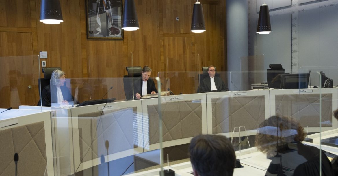 Presiding judge Larissa Alwin, center, reads the verdict in the class action case Milieudefensie et al. vs. Royal Dutch Shell plc.