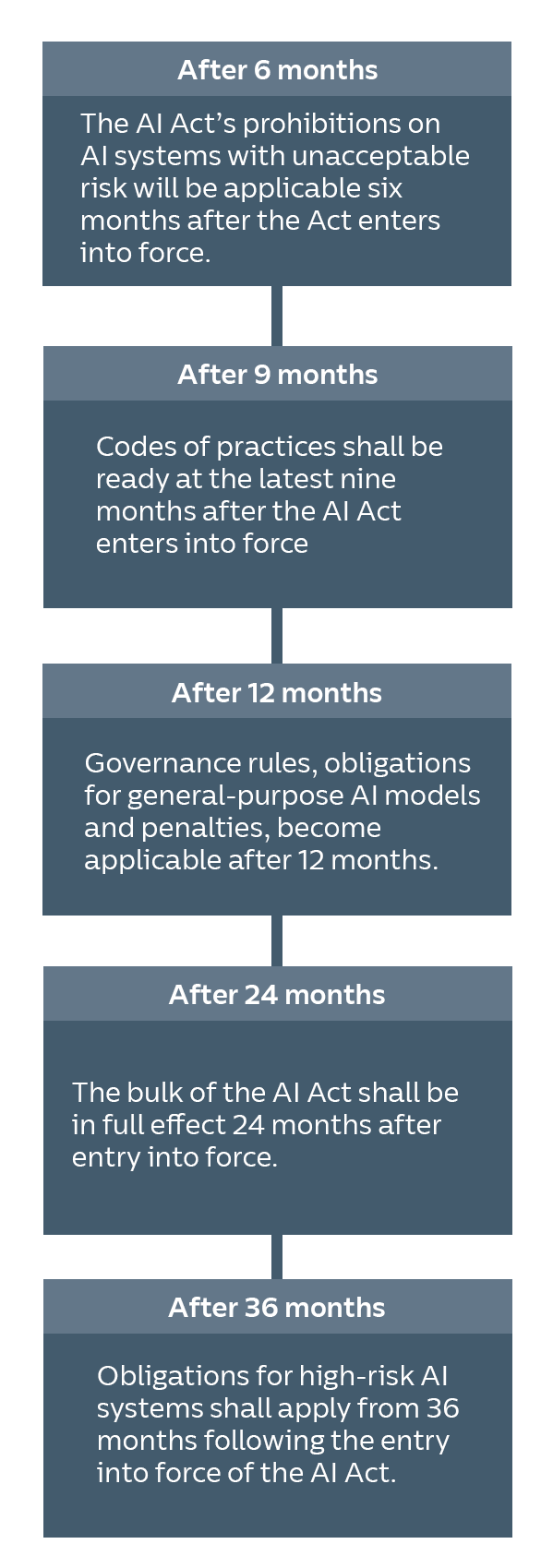 The AI Act is entering into force twenty days subsequent to its publication in the Official Journal. Following its entry into force, the rules of the AI Act will become applicable in stages:
