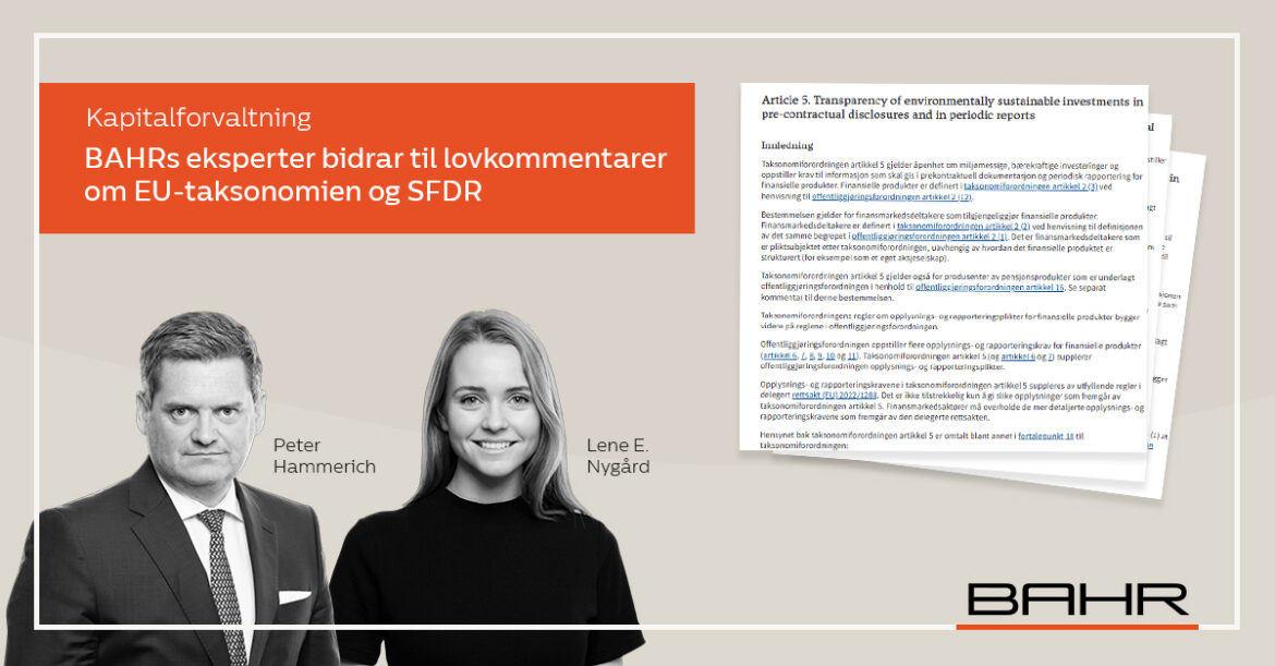 BAHRs virksomhetsgruppe for kapitalforvaltning og private equity er spesialister innen EU-taksonomien og Sustainable Finance Disclosure Regulation (SFDR), og rådgir klienter, samt avholder jevnlig seminarer, publiserer nyhetsbrev og faghefter om ESG og bærekraft for kapitalforvaltere. Partner Peter Hammerich og Specialist Partner Lene E. Nygård har forfattet Universitetsforlagets lovkommentar for SFDR og for deler av EU-taksonomien som nylig er publisert: